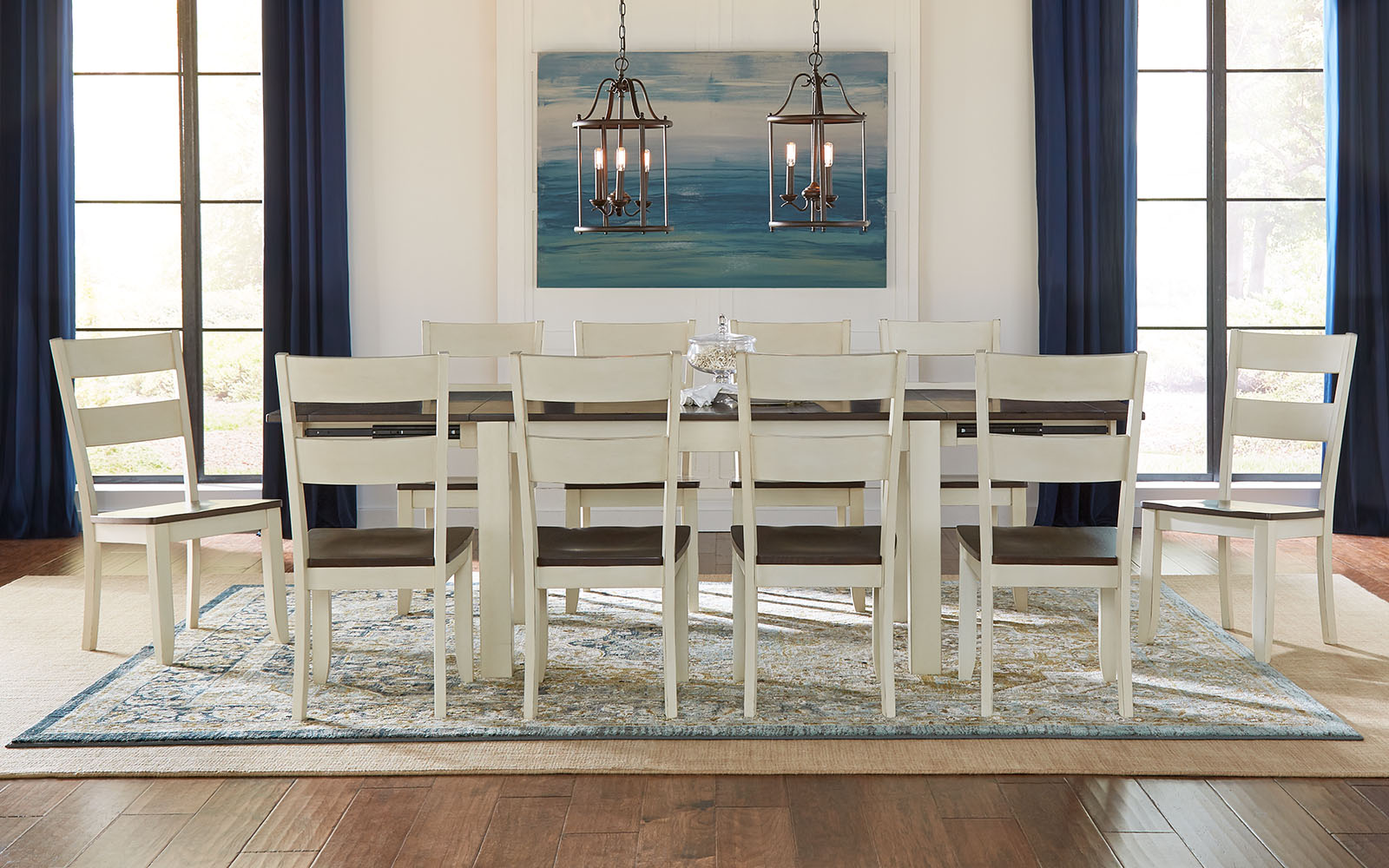 The Mariposa collection is all about function. Tables that can be used for small dining spaces can also be expanded to accommodate as many as twelve. The tables come with two to three 18″ butterfly leaves. It is a perfect style for today’s customer who prefers solid wood and appreciates a beautiful transitional contemporary look. It has a chalk finish with cream undertones.
