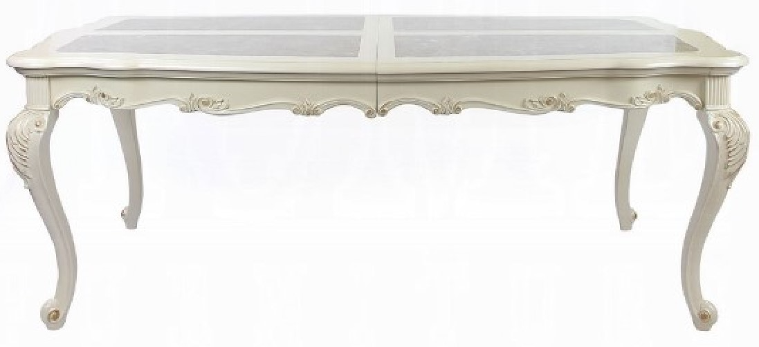 Designed exclusively for ACME, the Chantelle collection is filled with romantic wonder. This collection features a beautiful floral carved leg table available in two different sizes. Complemented by French rococo tufted rose gold upholstery chairs and matching hutch and buffet. This collection is perfect for any formal dining room.Read More