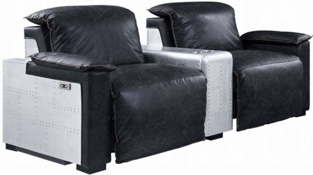 The Misezon Reclining Loveseat combines style with comfort, featuring aluminum patchwork detailing and black leather upholstery. It includes a power reclining mechanism, pillow-top armrests, and two integrated cup holders, making it a sleek and functional addition to any living space.Read More
