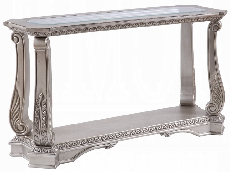 Entertain in style with the Northville Sofa Table. This classic rectangular occasional table features an Antique Silver and a tempered glass top. This distinctive cocktail is accented with wooden floral scrolled legs and a beveled glass insert and an open bottom shelf for ample storage and display.Read More