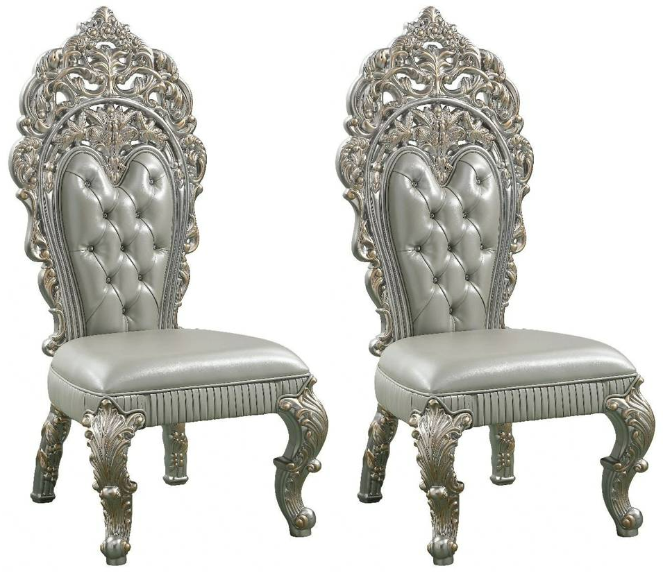 The button-tufted backrest is a standout feature of this side chair. Each tuft is adorned with sparkling crystal-like buttons, creating a stunning visual effect that adds a touch of glamour and luxury. The button tufting not only enhances the chair's elegance but also provides plushness and support for your back. Upholstered in synthetic leather, the chair exudes sophistication and offers a smooth and luxurious feel. The synthetic leather provides a durable and easy-to-clean surface, making it practical for everyday use while maintaining its refined appearance. Adding a regal touch, the chair boasts an elaborately carved crown on the backrest. This ornate crown showcases intricate patterns and adds a touch of grandeur and sophistication.