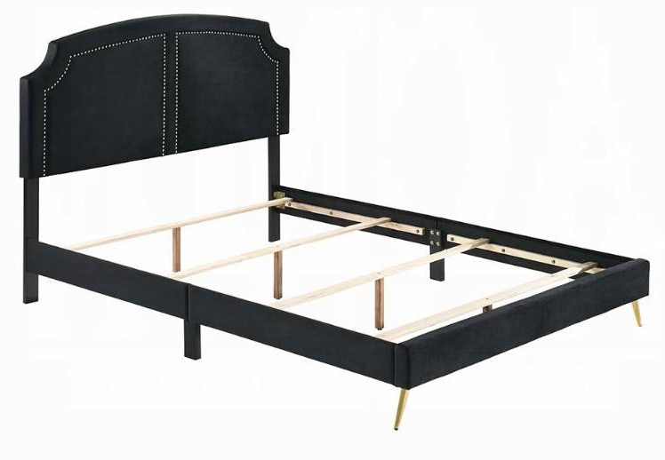 Black and gold are the embodiment of sophistication and chicness. Enjoy a good night's sleep with this Zeena contemporary bed. Gold-finished nailhead trim on the headboard lends a refined touch. Perched on beautiful and sturdy gold metal tapered legs that pop against the black finish.Read More