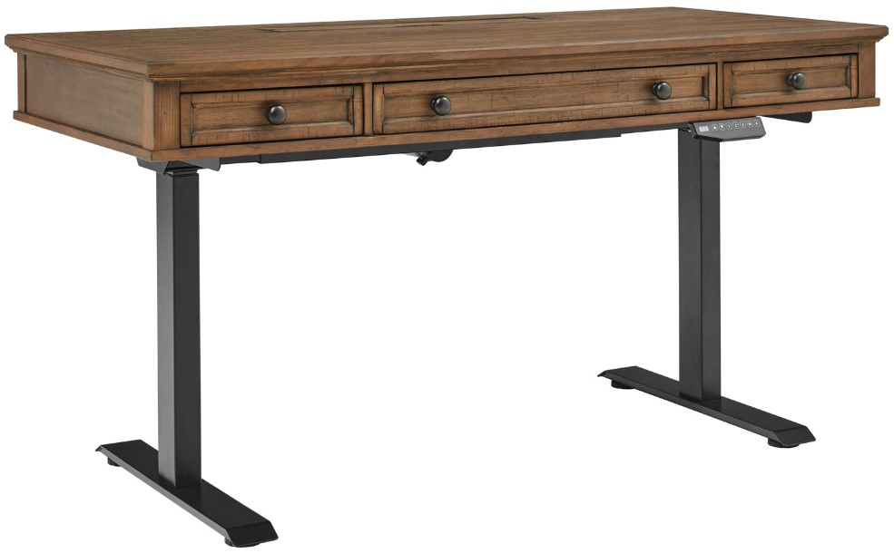 Hensley offers a classic, transitional style in a warm honey finish with beautiful aged brass finish hardware. Enjoy functional features throughout such as built-in AC and USB outlets, drop front drawers, adjustable height controls, removable dividers, locking file drawers, generous storage, cord management and so much more.Read More