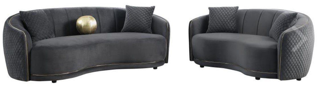 The gentle curvature of the sofa and loveseat silhouettes bring elegant flair to your living room. The outer surface of the back and arms adds diamond texturing, while vertical channel tufting adds dimension to the interior of each piece. The sofa adds a gold ball accent pillow and two in matching gray, while the loveseat includes two pillows in gray for added comfort.