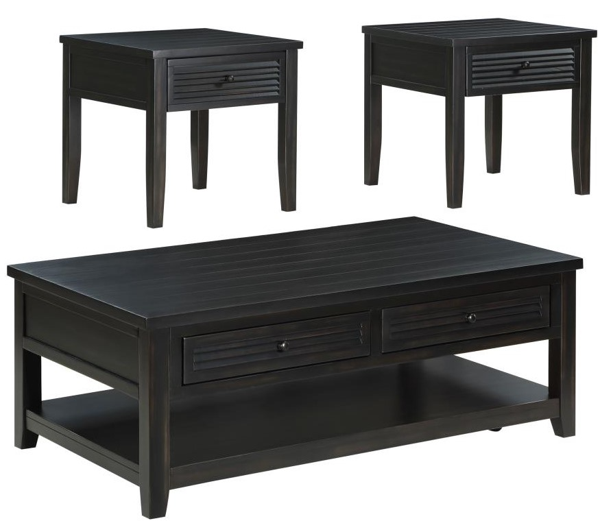 Coffee table set with distressed java finish over pine veneer for a rustic aesthetic