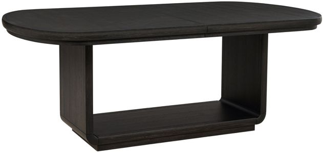 Rooted in quiet strength and sculptural beauty, this extension dining table brings graceful presence to every gathering. Its soft-edged rectangular top rests on a bold pedestal base, finished in burnished black for depth and contrast. When needed, a removable leaf extends the surface with the help of equalizing metal cable glides, allowing for smooth expansion.Read More