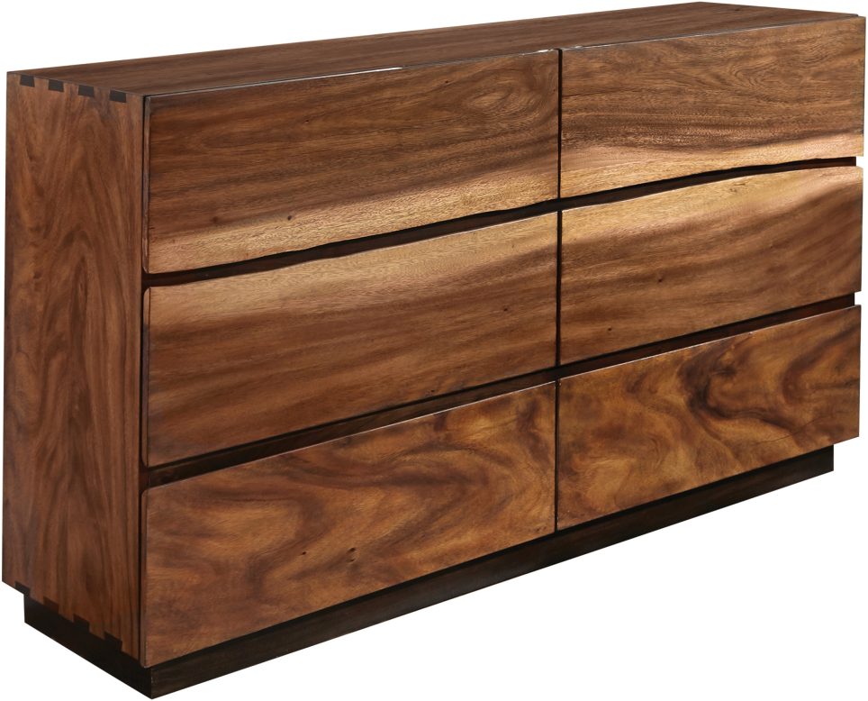 Add a striking, creative touch to a master bedroom. With eye-catching wood patterns and natural accents, this dresser really stands out. Its smokey walnut and coffee bean finish are enhanced by artsy, faded wood accents. Six spacious drawers allow ample storage options to keep your space organized. Pair it with a matching mirror to bring glamour and ease to your morning routine.