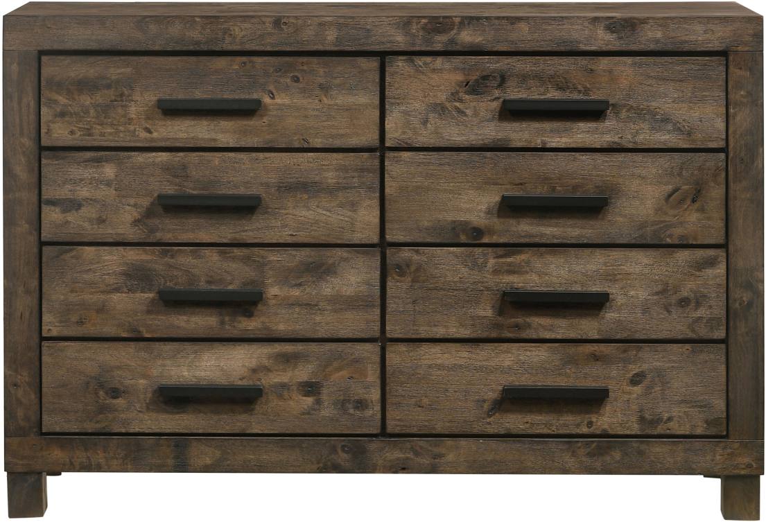 Bring a bedroom together with the rich, rugged design of this handsome, rustic style dresser. A golden brown finish with natural wood grains adds warmth and depth to its design. Eight storage drawers provide plenty of space for clothing and bedroom essentials. Wooden handles top each drawer for added style and ease of use. Pair this rustic dresser with a matching nightstand and chest to instantly amplify your decor.