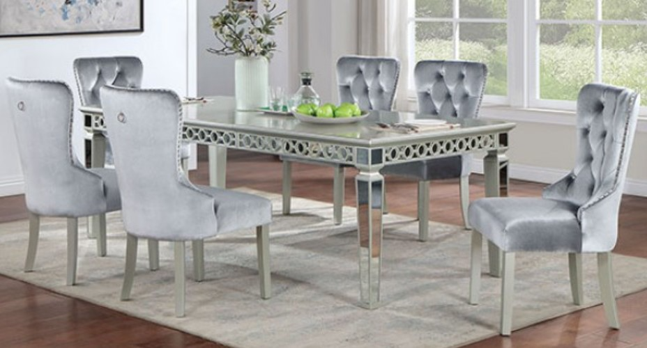 Dining in style is easy with this fabulous gray dining set. The table features intricate mirror designs on the apron and legs, brightening the room with soft, natural light reflections. Padded flannelette chairs add comfort to the chic design with their tufted wingbacks, nailhead trim, and soft gray tones.Read More