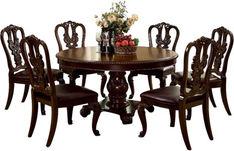The centerpiece of this set is the beautiful pedestal table, which comes in two styles, adorned with intricate designs on the base and the apron. Three options for the side chairs are offered, as well as a matching mirror and server finished in brown cherry.Read More