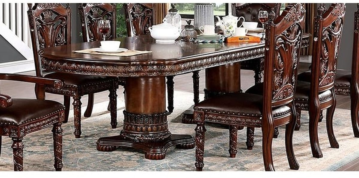 Bold and grand are some of the words that would describe this traditional dining set. Two pedestal bases hold the large tabletop adorned with an intricate apron design. Make a bold statement by incorporating this stunning table into your home.Read More