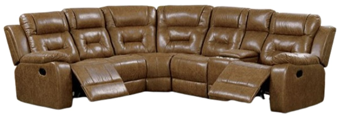 The Furniture of America® Ezekius Brown Manual Reclining Sectional offers spacious seating with multiple manual recliners for ultimate comfort. Upholstered in soft brown fabric, it provides both durability and support. The sectional's sturdy construction ensures long-lasting use, while its reclining feature allows effortless adjustment for a relaxed, cozy experience.Read More