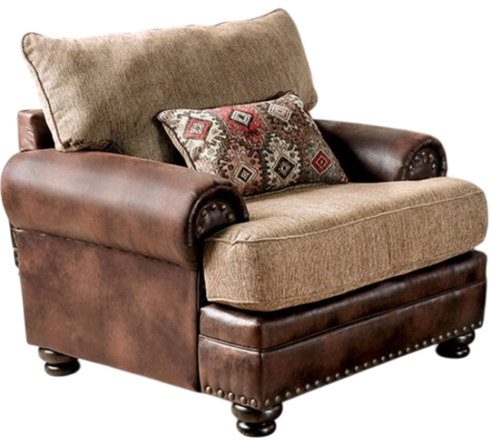 Fearlessly mix traditional designs with rustic palettes and textures. The contrast of soft chenille with masculine leatherette is makes for a tantalizing experience. Highlighting the contrasting styles further is a the curling rolled arms and nailhead trimming. The usually shimmering silver dots are replaced by brass heads for homemade finish that frames the unique set pieces.Read More