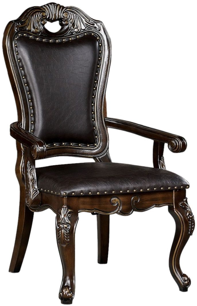 Ideal to fit any traditional space, this bold dining piece takes queues from classical design and incorporates them beautifully. The chairs come in luxurious leatherette seats and backs with beautiful curved cabriole legs and arms with vine-like details to match the foliage motif of the set.Read More