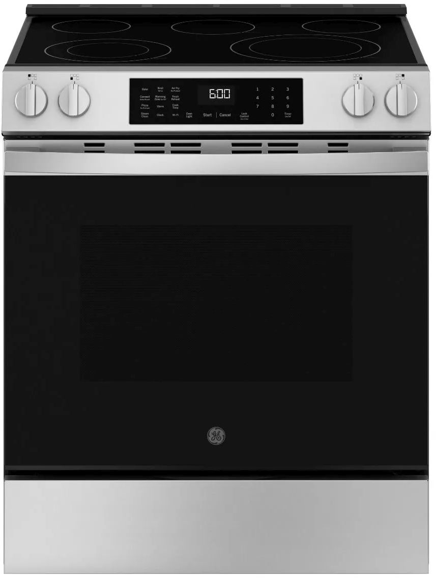 GE® 600 Series 30" Fingerprint Resistant Stainless Steel Slide-In Electric Range features EasyWash™ Oven Tray, Built-In WiFi, No Preheat Air Fry, No Preheat Fresh Reheat, 9"/6" Power Boil™ Burner, Fifth Element Warming Zone, and Hidden Bake Element.Read More