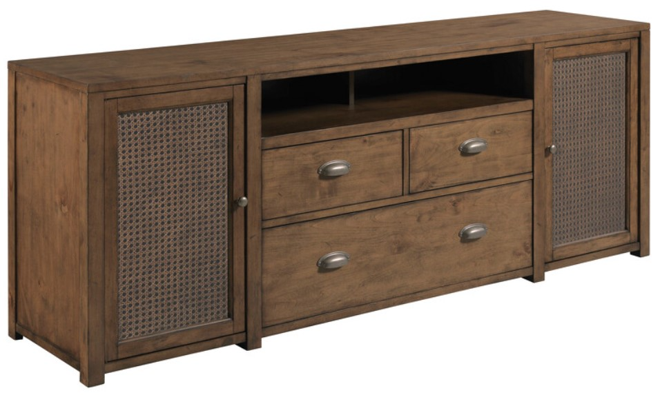 This casual styled entertainment console complements any decor. It is constructed of Alder veneers and select hardwoods with two doors crafted with cane fronts that open to reveal two adjustable wood shelves. This piece provides wire management, hand holds in back of case, and adjustable levelers.Read More