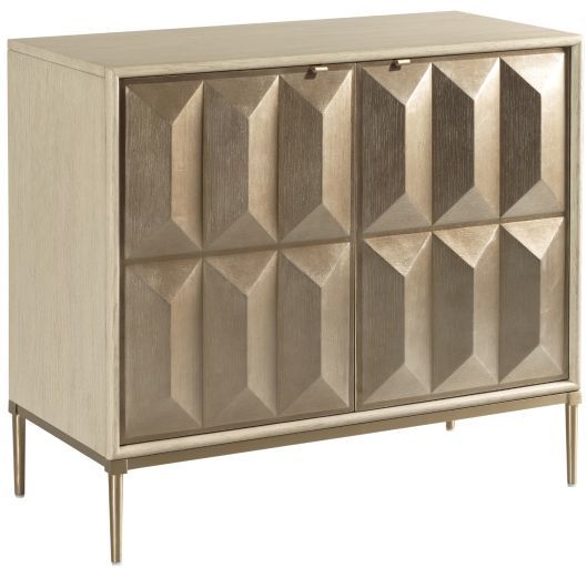 The Prism chest features two interior drawers. Two removable wood shelves behind the doors. Vent slots, adjustable levelers, and hand holds in the back of the case. Lenox is crafted in an Alabaster finish with cathedral and quartered white oak, and a brassy, champagne metal finish.Read More