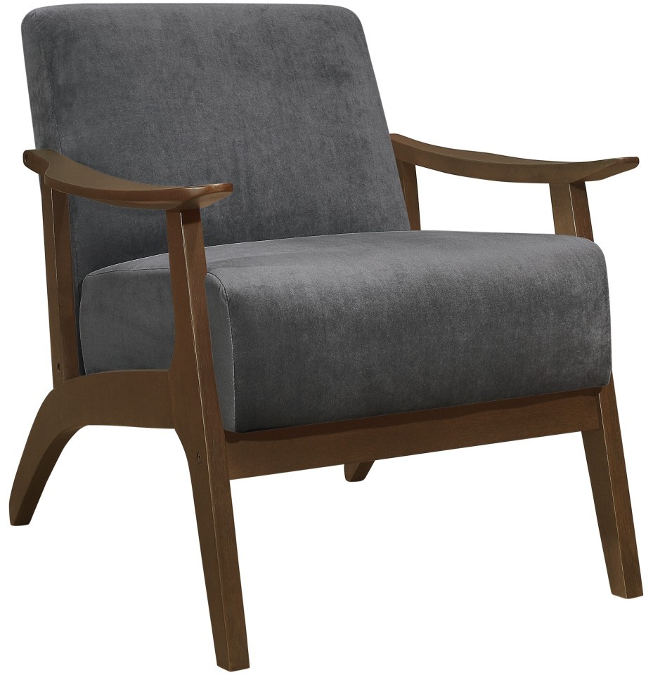 The frame of the Carlson chair recalls a time when simplicity of profile was the height of style. The streamlined design of the chair's subtly sloped wood arms and legs is finished in dark walnut which serves to highlight the blue-gray velvet covering.Read More