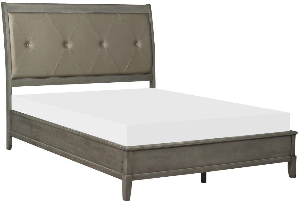 With transitional styling that is at home within a number of decorative environments, the Cotterill Collection will be a versatile addition to your bedroom. The gray finish, over birch veneer, dramatically enhances the wood’s grain and is perfectly accented by the gray faux leather insert with x-stitching and button-tufting that fronts the full headboard.Read More