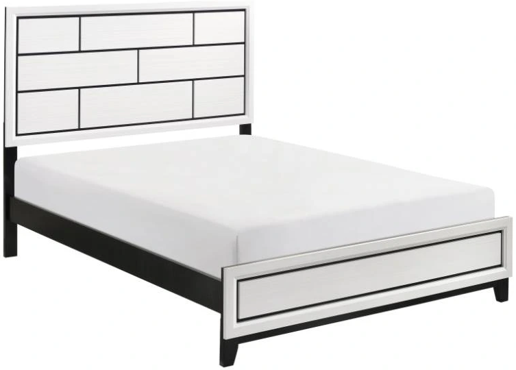 The defining black lines of the distinct framing of the full bed effectively accent the printed white wood grain on melamine veneer.