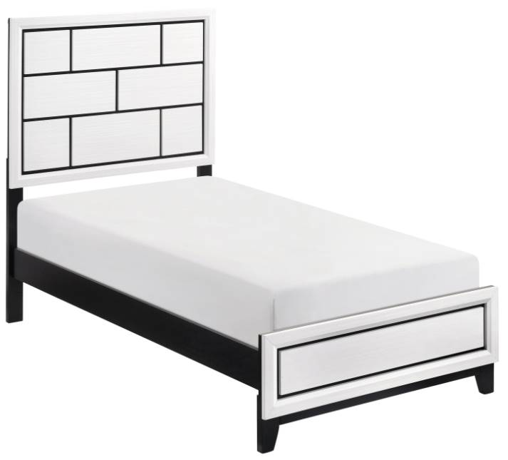 The defining black lines of the distinct framing of the twin bed effectively accent the printed white wood grain on melamine veneer.
