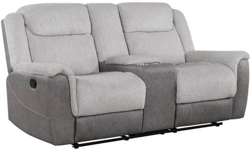 The built-in center console includes dual cup holders and a storage compartment, making it perfect for keeping drinks, remotes, and essentials within reach. Upholstered in soft yet durable two-tone fabric, this loveseat blends modern style with cozy appeal. Built with a sturdy metal seat frame and reinforced reclining system, it ensures long-lasting durability and a dual reclining operation, making it the ideal addition to your living room, home theater, or entertainment space.