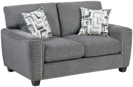 The textured dark gray fabric upholstery complements a variety of décor styles, while the nailhead trim detailing adds a touch of sophistication. The sturdy block feet provide a stable foundation, making this loveseat a perfect addition to apartments, small living rooms, or cozy nooks. Enjoy the perfect blend of comfort, style, and practicality with this contemporary 2-seater sofa.