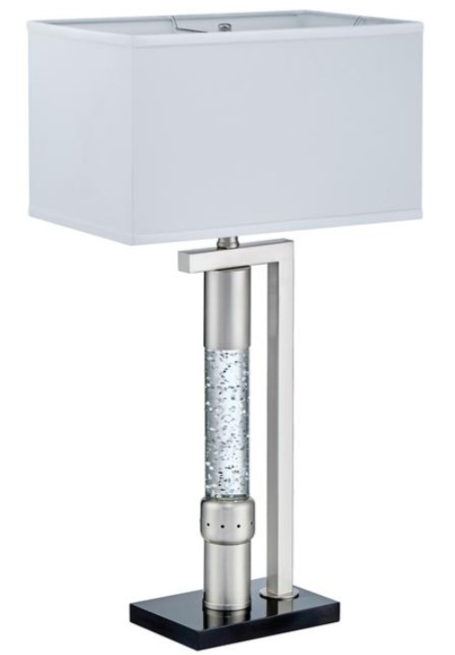 This accent lighting can change the ambiance of any room. Its ultra modern design showcases sparkling decorative mood light, with tiny rippling water-droplets to simulate the soothing dancing water motion. Beautifully crafted stand features high quality satin nickel finish metal and glass, and an elegant rectangular lamp shade on black base.Read More
