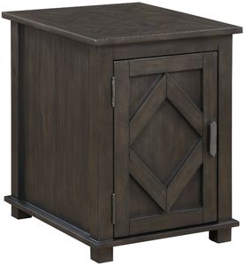 The single cabinet features an adjustable shelf, providing flexible and concealed storage for books, magazines, or remote controls, keeping your space tidy and organized. The barn-door inspired design on the front panel, along with a sleek gunmetal bar pull, adds a distinctive rustic-industrial touch. With its thoughtful design and no assembly required, this chairside table offers both stylish aesthetics and convenient functionality right out of the box.