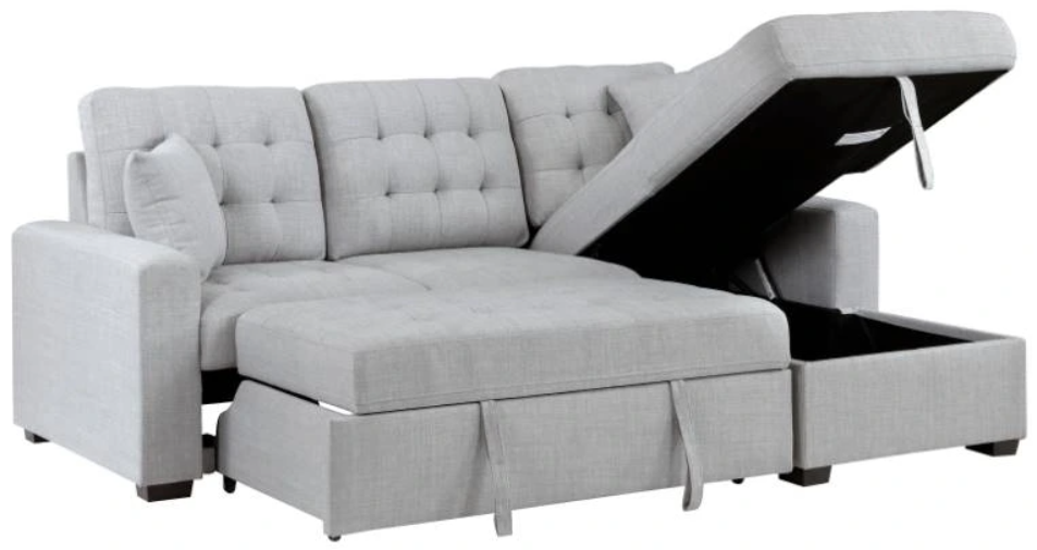 Conveniently stored beneath the left-side two-seat unit is a pull-out trundle that rises to create a bed while the top of the attached right side chaise opens to reveal under-seat storage.
