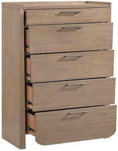 Add stylish and efficient storage to your bedroom with this contemporary five-drawer chest, featuring a chic light brown finish that enhances any modern decor. Crafted from a durable blend of hickory veneer, wood, and engineered wood, this chest is built for lasting quality and aesthetic appeal.Read More