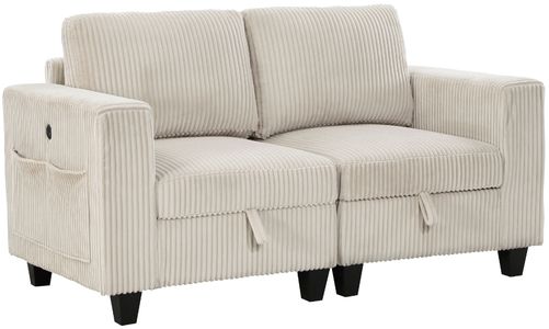 Pull-out storage drawers are neatly tucked beneath the seats of the love seat, each drawer easily accessible with a pull to the front-mounted loop handle. The paired end seats arm's provide side support and power charging ports. The collection is covered in beige corduroy fabric for a neutral complement to your home’s décor.