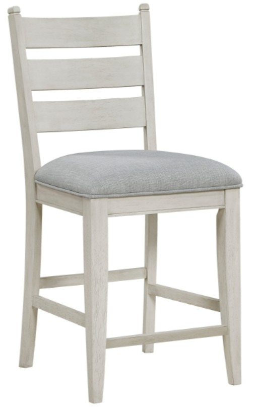 This charming counter height stool, featuring a weathered white finish and a comfortable textured fabric upholstered seat, offers a perfect blend of rustic elegance and inviting comfort for your kitchen island or bar area. Crafted with a sturdy wood frame, its timeless ladder-back design and gentle distressing add character and warmth.Read More