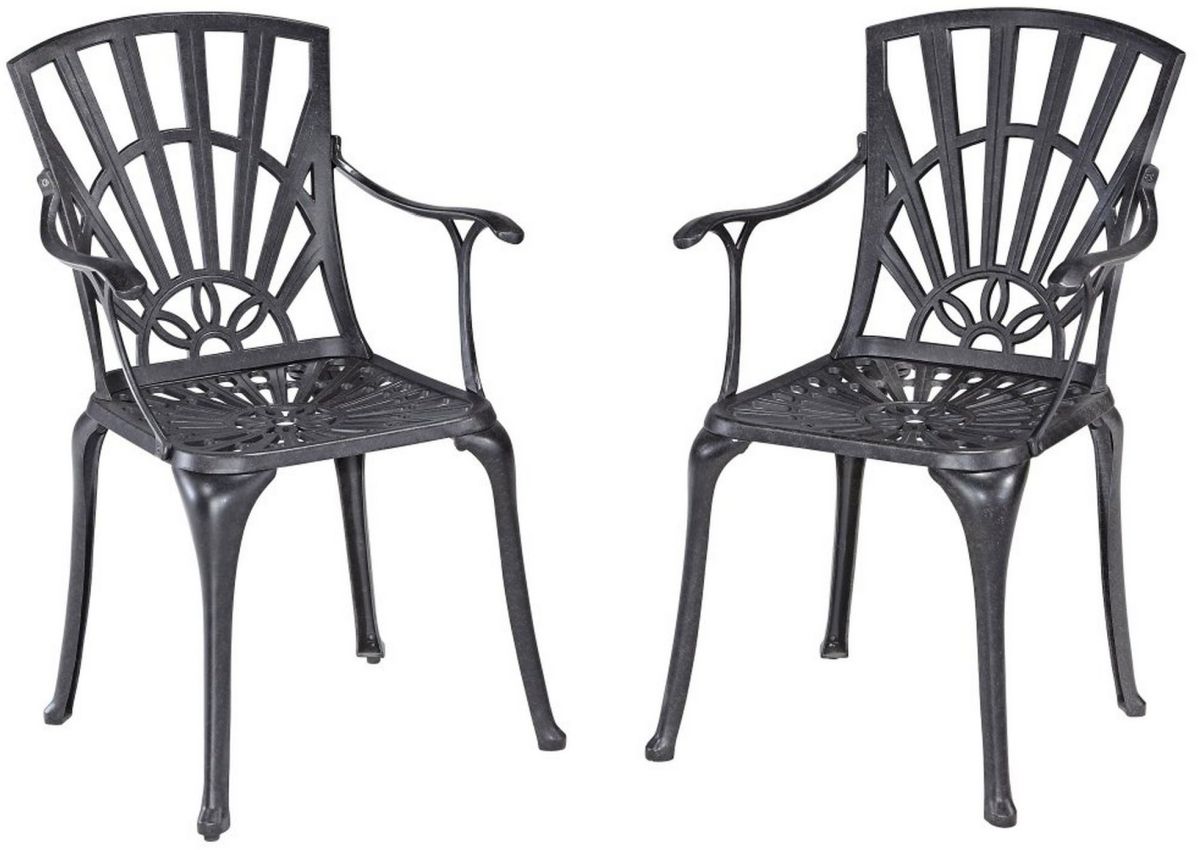 Create paradise in your own backyard. This Grenada pair of arm chairs by homestyles has a cast aluminum frame and is UV-resistant, with a hand-applied, powder-coated finish that's sealed with a clear coat. These chairs pair perfectly with the Grenada Dining Table. The seat design prevents water from collecting and nylon glides help hold it in place.Read More