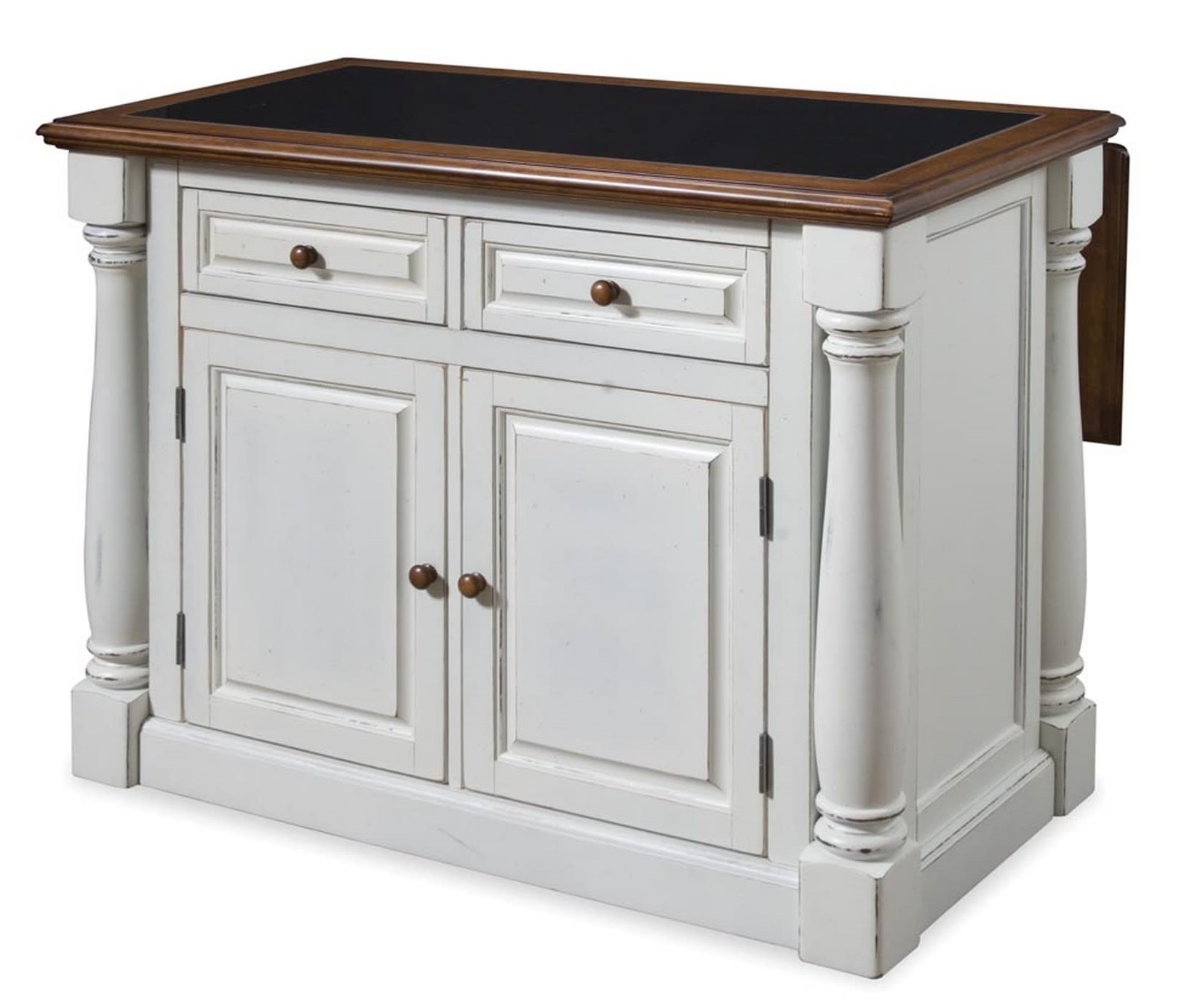 Transform your kitchen into a grand culinary space with the Monarch Kitchen Island by homestyles. This piece brilliantly combines luxurious style and high functionality with its impressive design and excellent storage space. It features two drawers and a cabinet with four adjustable shelves inside each. Meanwhile, its patented hidden sliding mechanism easily expands the work surface, making it stand out from others on the market. This kitchen bar's solid hardwood construction, distressed oak-finished top with black granite inset, and sanded, white distressed finish give it a rustic appeal. Comes carefully packaged with all items labeled and coordinating easy-to-follow assembly directions.