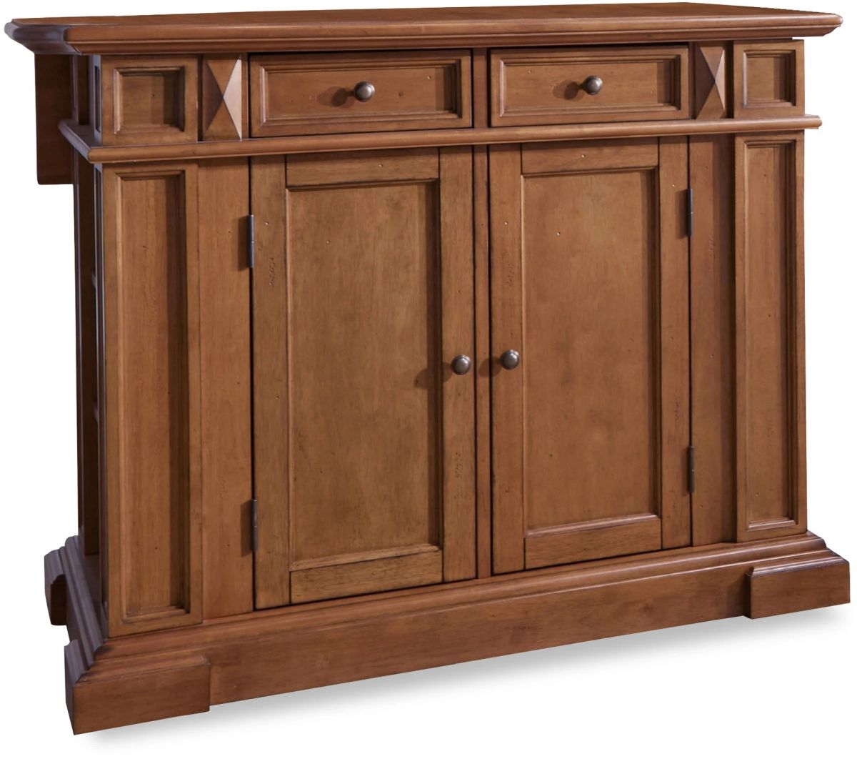 This homestyles Kitchen Island is constructed of solid hardwoods and veneers with a rich, distressed oak finish for an aged look. Features include a convenient drop leaf that raises to provide additional dining and serving space, antique brass finished hardware, easy glide storage drawers, raised detail cabinet doors with adjustable shelves inside, and open storage on each end with an adjustable shelf.