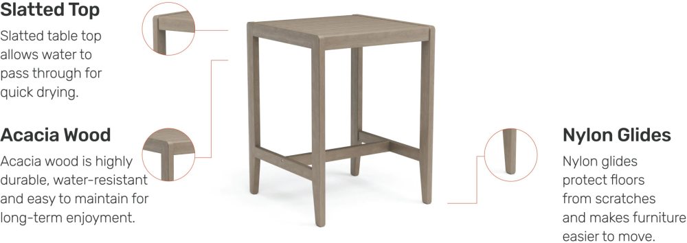 Elevate your outdoor spaces with this Homestyles Sustain Bistro Table. Add Sustain barstools to bring up to four people closer together to enjoy clean, classic styling and cushioned comfort. The entire table is made of water-resistant, gray acacia wood with a UV-resistant finish that delivers solid performance year after year.Read More