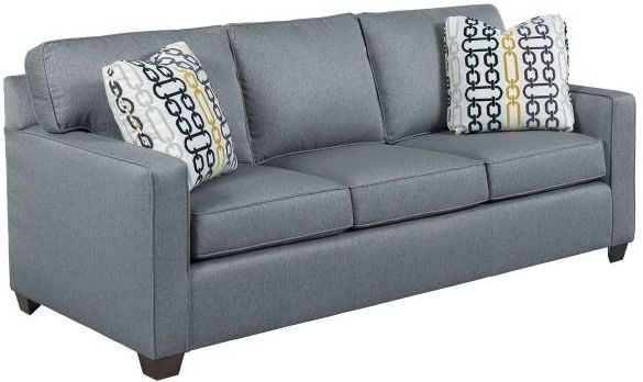 This Brooke sofa features two accent pillows, loose back, track arms, square bun feet, and comes in a gray fabric.