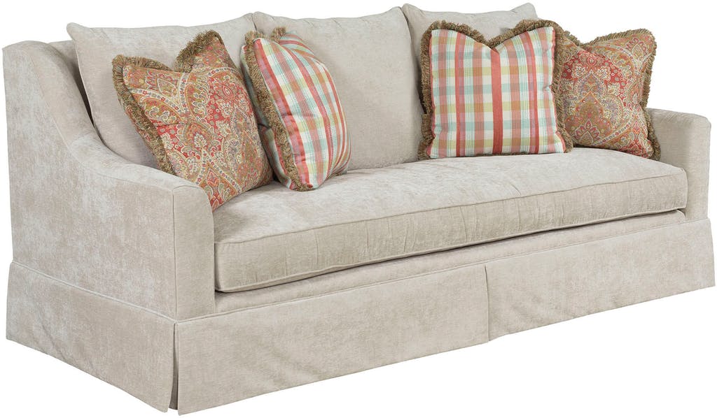 Finley sofa has three loose back cushions, four toss pillows, sofa also has a skirt going around the bottom.Read More