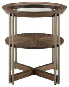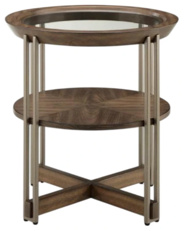 Each table features a wood-framed, clear glass top that creates a window to its stunning wood base and elegant metal legs. A warm Walnut finish highlights the rich grain patterns showcased by its hickory veneers and is paired with Tarnished Silver metal legs. Place these stunning tables anywhere you need a bit of undeniably chic character.