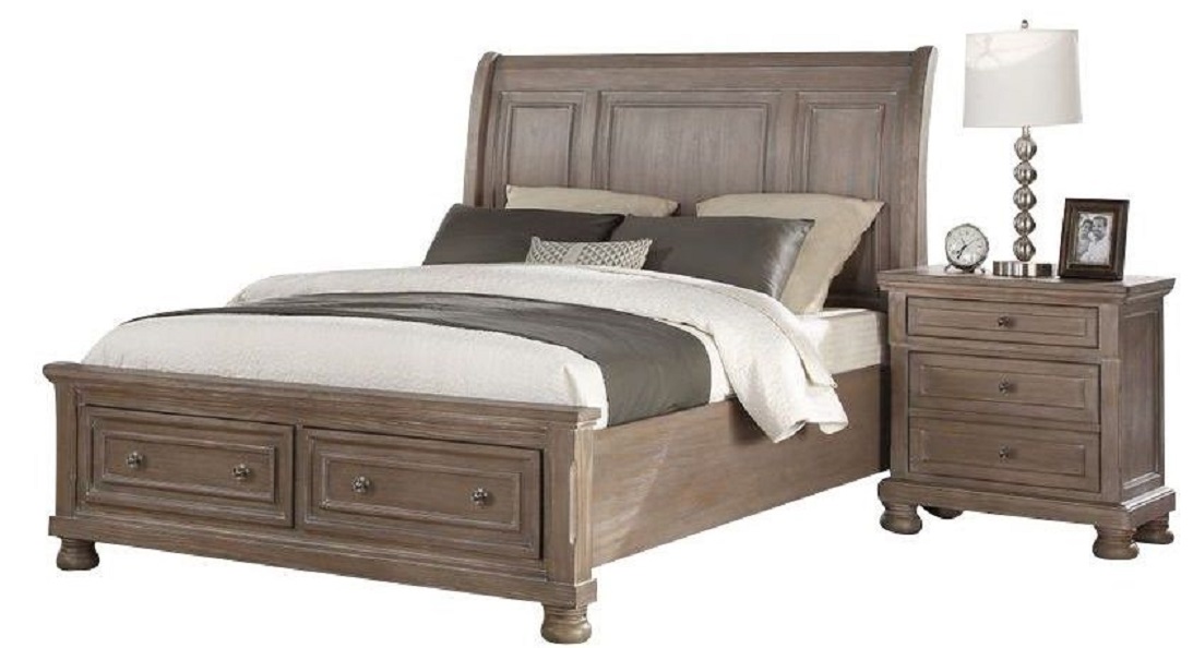 New Classic Furniture Allegra storage bed in pewter finish with quality characteristics such as English dovetailed drawers, complete expansion glides, Mindi solids and veneers felt lining and beautifully finished, stained pewter with unique white brushed accents.