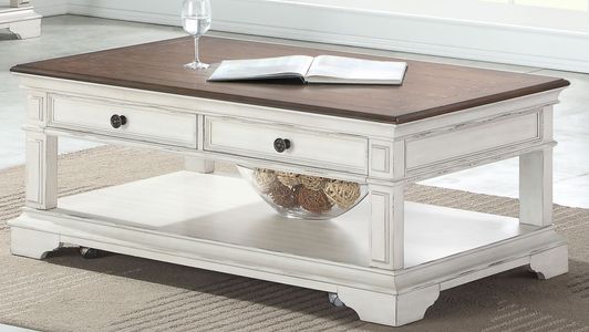 Cocktail table with 2 drawers and shelf featuring a two tone brown & white finish.Read More