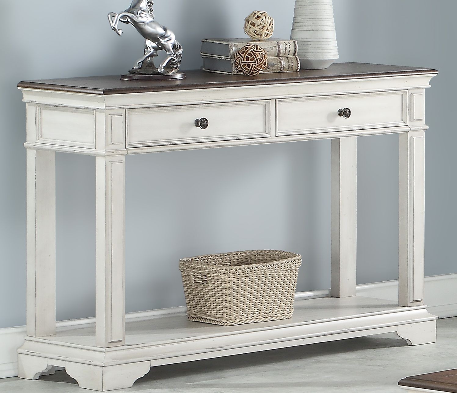 Console/Sofa table with 2 drawers and shelf featuring a two tone brown & white finish.Read More