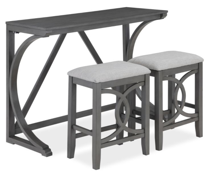 The Bella Dining 3 Piece Counter Set is the perfect blend of beauty, durability, and function. The grain of the solid Rubberwood and Mindi veneers is highlighted by the clean, contemporary gray finish, a result of a meticulous multistep process. Small space friendly, this dining table fits into small nooks or behind a sofa, perfect for extra seating and workspace. The comfortable counter stools feature 100% polyester, easy-care gray upholstered seat cushions. Supported by solid wood legs and reinforced with base stretchers, these stools are not only cozy but built to last. The distinctive design of this dining set adds an artistic flair to your space, featuring gracefully curved wood table supports, interlocking half circles on the stools, and bracket table feet. To make life even more convenient, the Bella counter table has built-in USB chargers, ensuring your devices stay charged while you work or play.