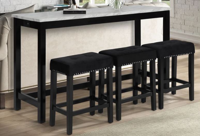 The Celeste theater bar table and 3 stools adds a touch of glamour to your home. The faux marble top is a beautiful white and gray pattern that is set off by the black solid wood table frame. The top is heat and water-resistant, super easy to care for, and a statement-making design. The table is surrounded by 4 upholstered velvet bar stools, made of solid wood and with side, front and back stretchers for strength and durability. The plush memory foam cushion is so comfortable, and the silver nailhead trim accents both the chair and the marble top of the Celeste.