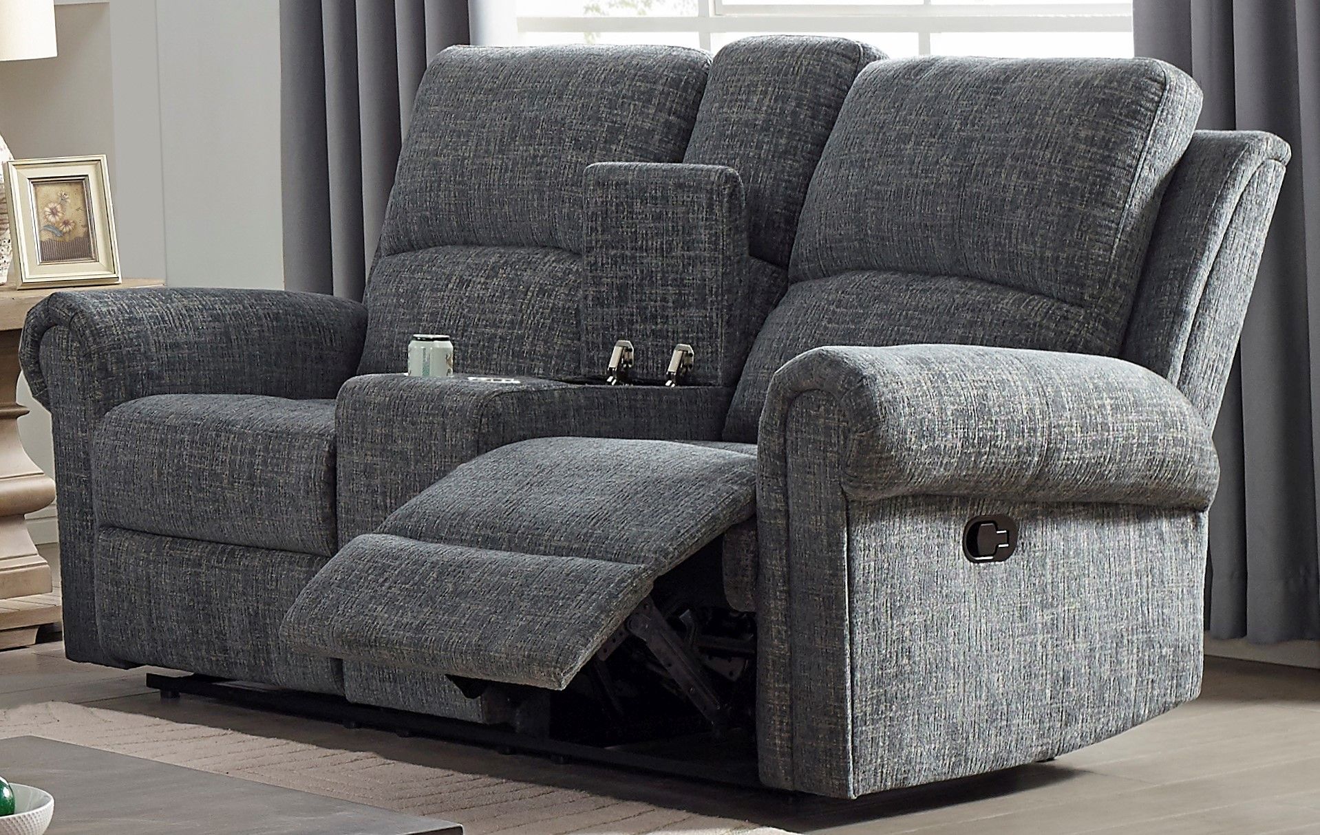 The Connor Sofa features sports classic styling with rolled arms, fully upholstered chaise recliners, and pillowed headrest. The soft gray polyester fabric is durable and inviting. A handy storage console in the loveseat provides space for remotes and silver cupholders for your favorite beverages. Available in manual and power recline options.
