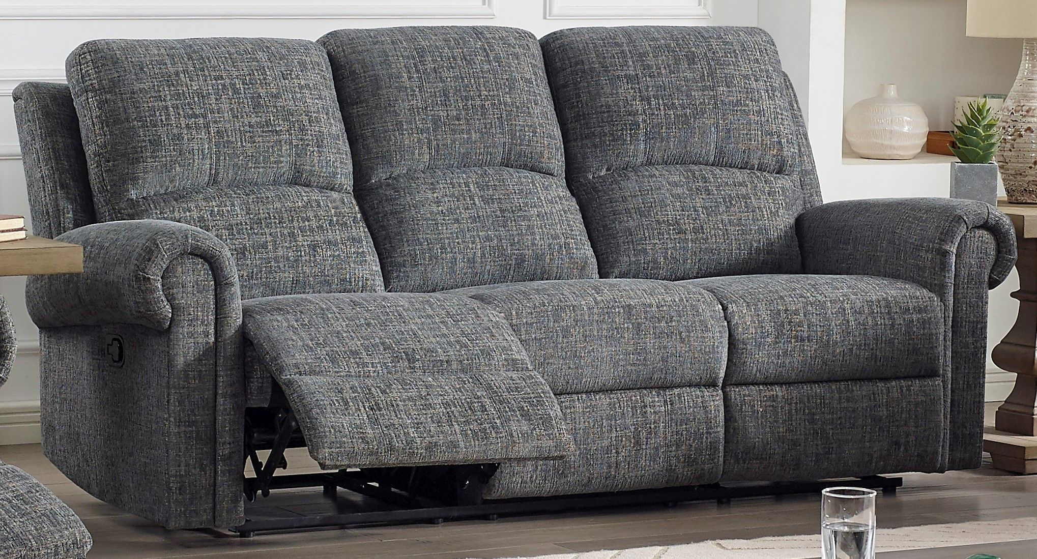 The Connor Sofa features sports classic styling with rolled arms, fully upholstered chaise recliners, and pillowed headrest. The soft gray polyester fabric is durable and inviting. A handy storage console in the loveseat provides space for remotes and silver cupholders for your favorite beverages. Available in manual and power recline options.