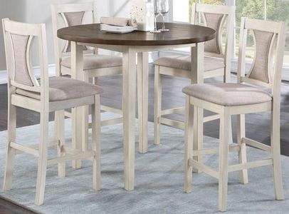 The Hudson dining table set includes one round counter table and four counter stools. It comes in a two tone brown and creme finish. The chair features fabric upholstered back and seat.