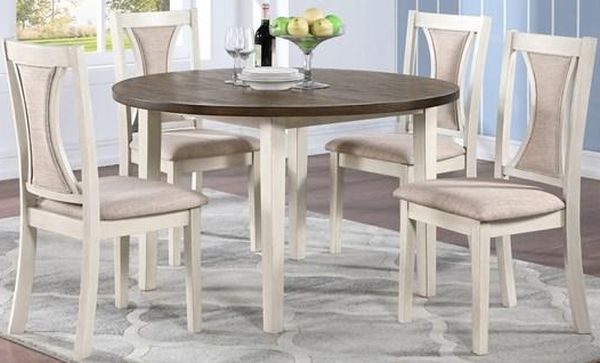 The Hudson dining table set includes one round dining table and four side chairs. It comes in a two tone brown and creme finish. The chair features fabric upholstered back and seat.