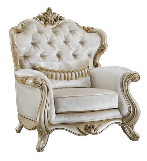 The Monique Pearl Chair features a button tufted camel back, rolled arms and one throw pillow.